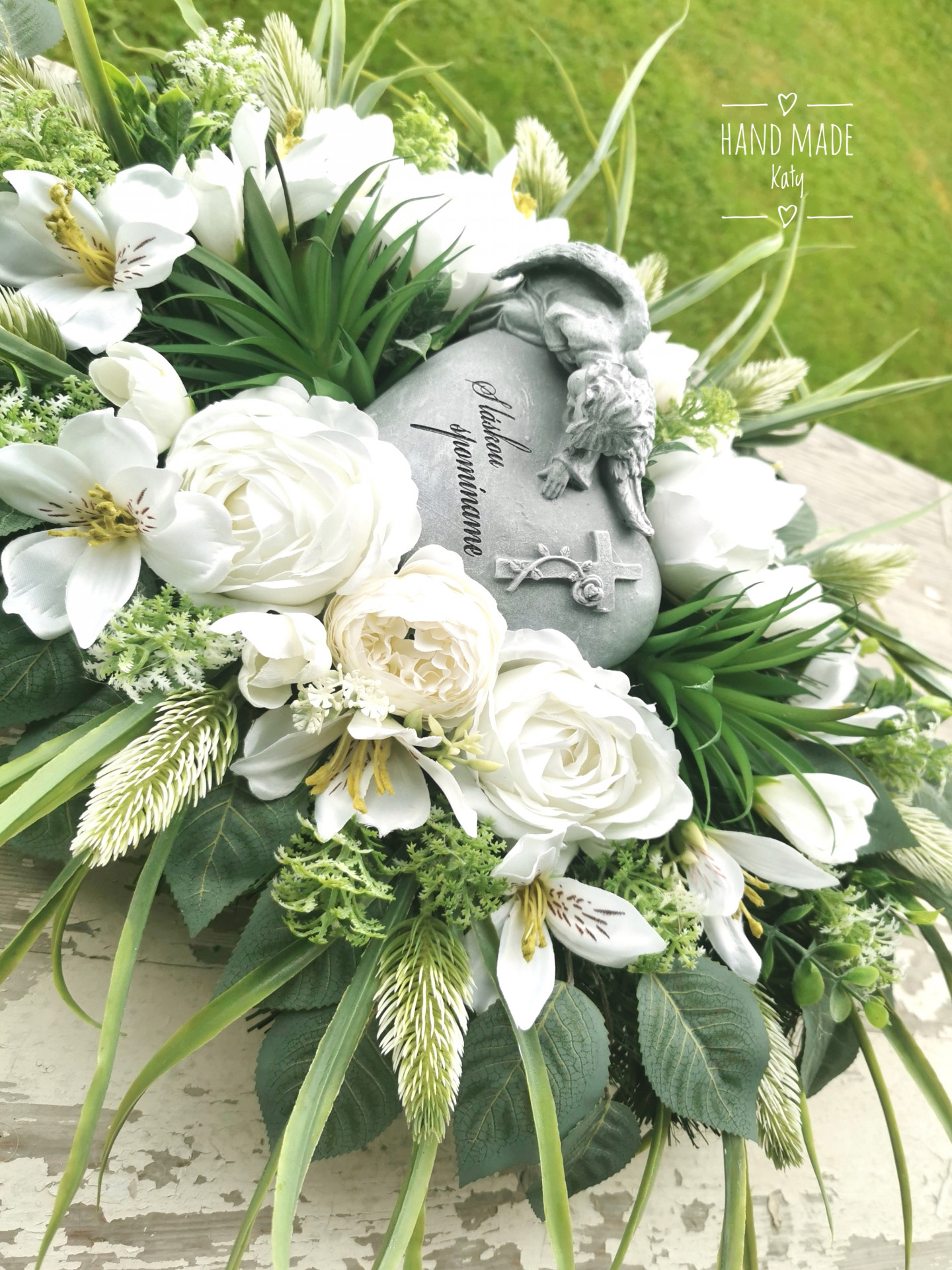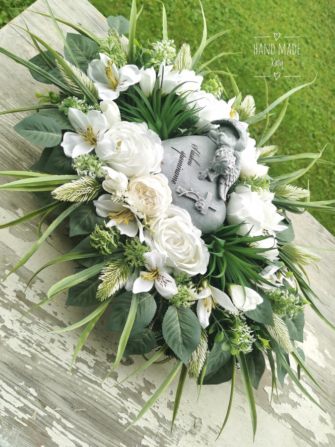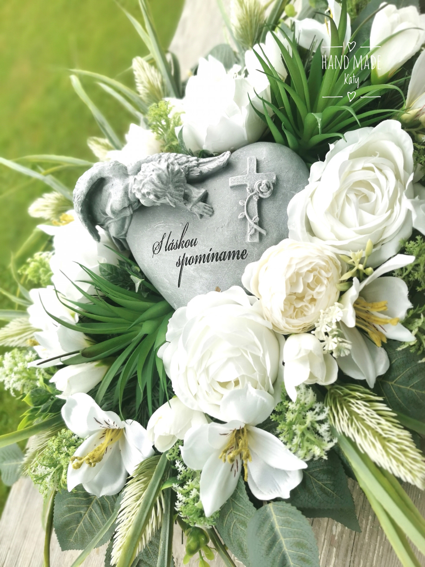 ARANŽMÁN NA HROB V JEMNÝCH FARBICKACH S ANJELIKOM NA SRDIECKU. SUKULENTY, PIVOŇKY, ZELEŇ. MATERIÁL PLAST. ROZMERY 66*45CM