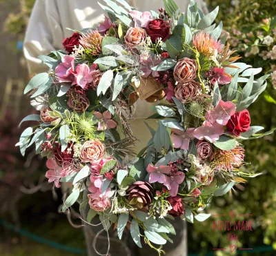 NOVINKA. MATERIÁL PLAST. VEĽKÝ STRAPÁČIK, EUKALYPT POPULUS PLUS KRÁSNE RUŽE A HORTENZIE ČO VYZERAJÚ AKO SUŠENÉ. SKALNÉ RUŽE A BOLULKY. ZO ZADNEJ STRANY JE UŠKO NA SPAGATIK ALEBO STUŽKU, VENIEC NIE JE MOC ŤAŽKÝ. PRIEMER CCA48- 50 CM