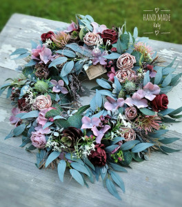 VENČEKY A DEKORÁCIE Novinka. Materiál plast. Veľký strapáčik, eukalypt populus plus krásne ruže a hortenzie čo vyzerajú ako sušené. Skalné ruže a bolulky. Zo zadnej strany je uško na spagatik alebo stužku, veniec nie je moc ťažký. Priemer cca48- 50 cm VYPREDANÉ Cena vrátane DPH: 45.90 € Do košíka