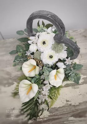 Drevené srdiečko na podstavci, naaranžovane kvalitným materiálom. Krásne anglické ruže čo vyzerajú ako sušené, sukulentov a veľa zelene. Dĺžka cca 60cm,je aj zaťažené.