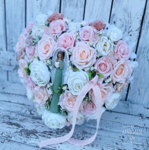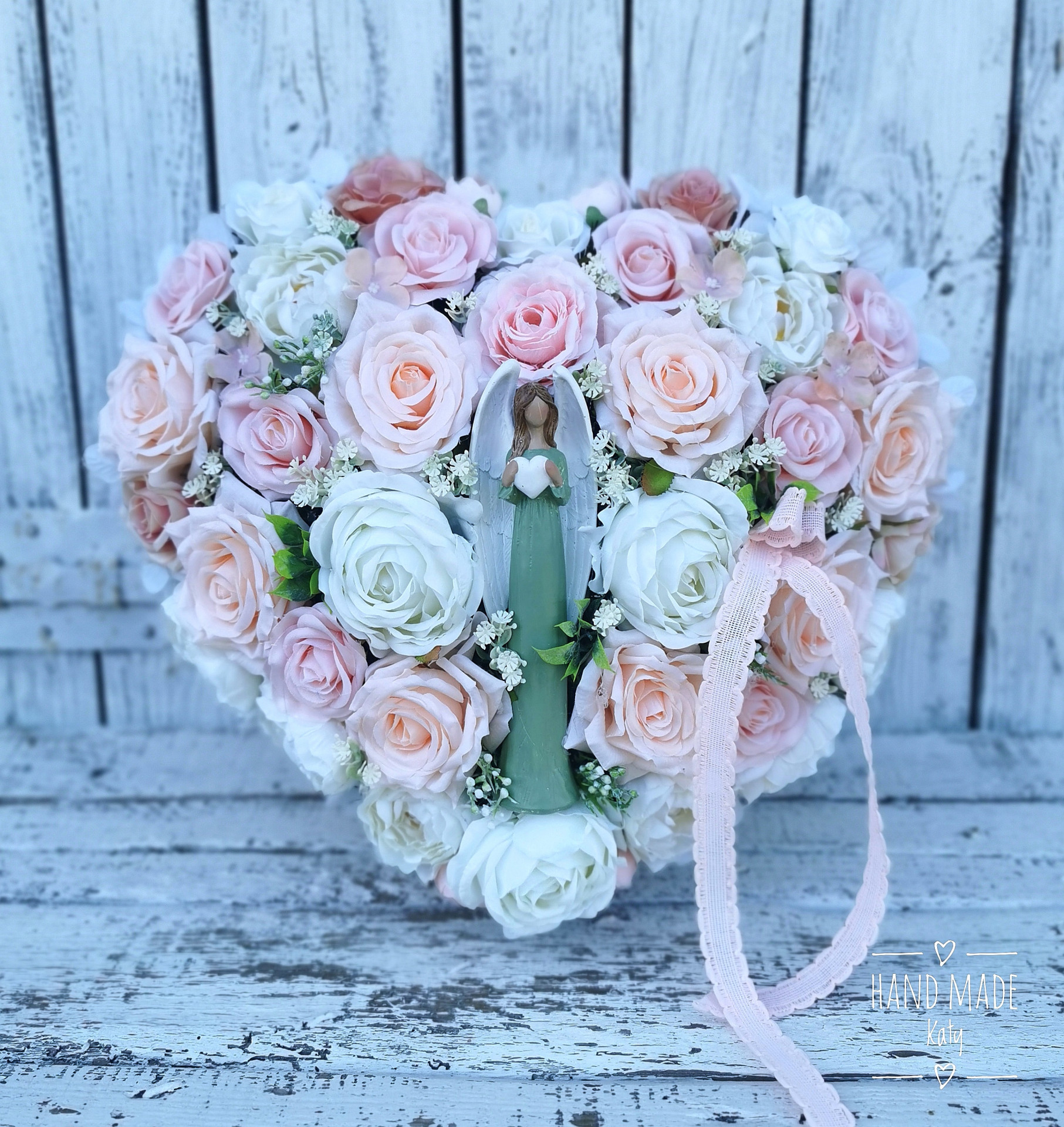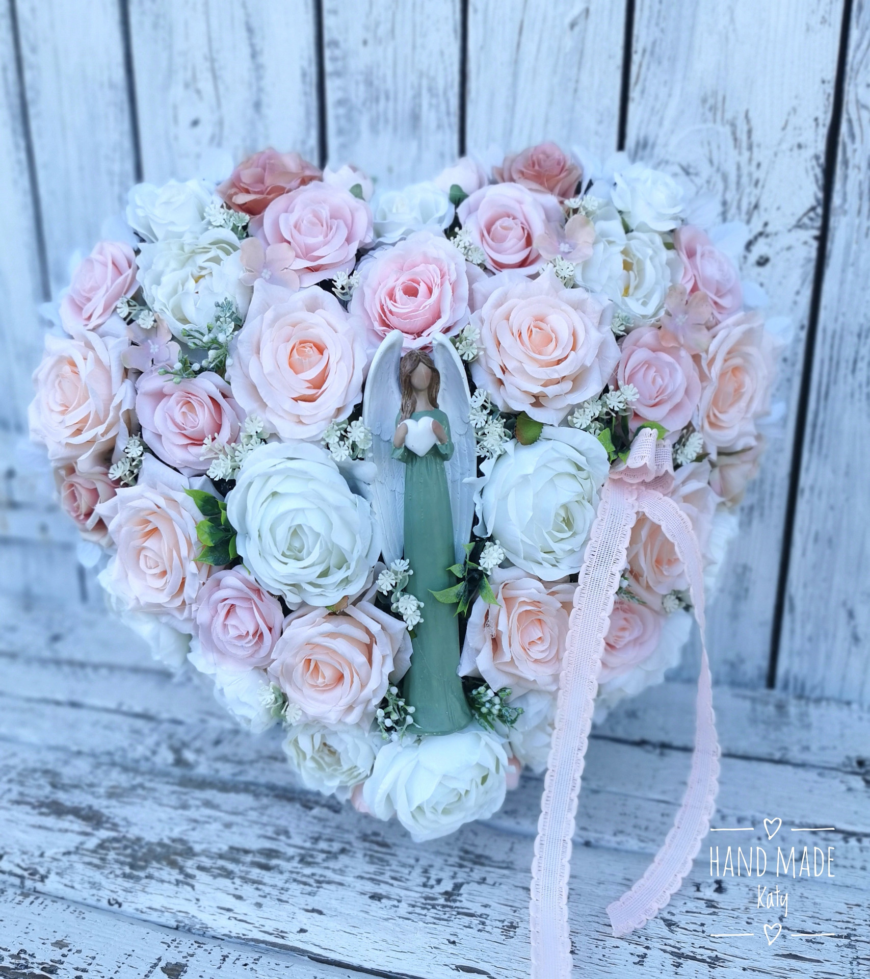 Zaťažené srdiečko na hrob v jemných marhulkovych farbickach s anjelikom. Srdiečko je naaranžovane v zaťaženéj nádobe. Rozmery 46*46cm. Materiál plast.