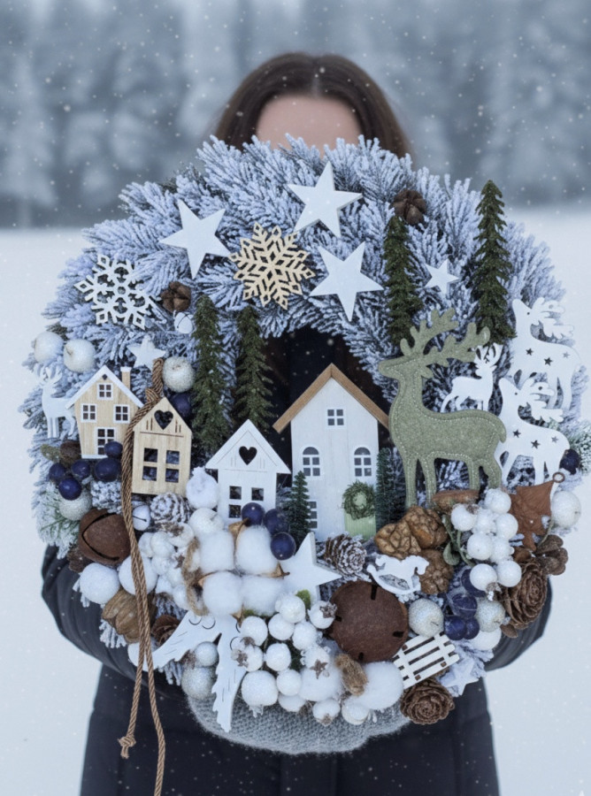 Zimný veniec naarazovany na kvalitnom základnom venci. Zo zadnej strany je uško na spagatik alebo stužku.